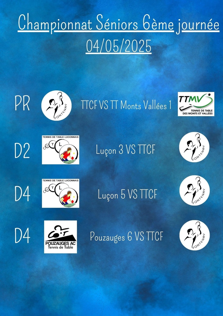 Annonce de la 6ème Journée de Championnat : Dimanche 4 Mai, 2 de nos 4 équipes joueront le match de la montée. Cela concerne la PR qui recevra TT Monts et Vallées à 14h30 et la D4 (5) se déplacera à Pouzauges !!! Notre D2 et la D4 (4) se rendront à Luçon pour essayer de ramener un bon résultat. Le maintien est assuré pour ces 2 équipes. Notre R3 jouera que le 18 Mai. Venez nombreux encourager notre équipe 2 à domicile !!!