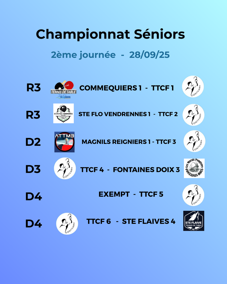 Ce week-end, 2ème journée de championnat Séniors. La D3 et D4 (6) joueront à domicile à 9h contre Fontaines Doix et Ste Flavie des Loups 4. A l'extérieur, les deux R3 se déplace à Commequiers 1 et Ste Flo Vendrennes 1, la D2 elle ira à les Magnils Reigniers 1. La D4 (5) est exempte pour cette journée. Allez le TTCF🏓🏓🏓