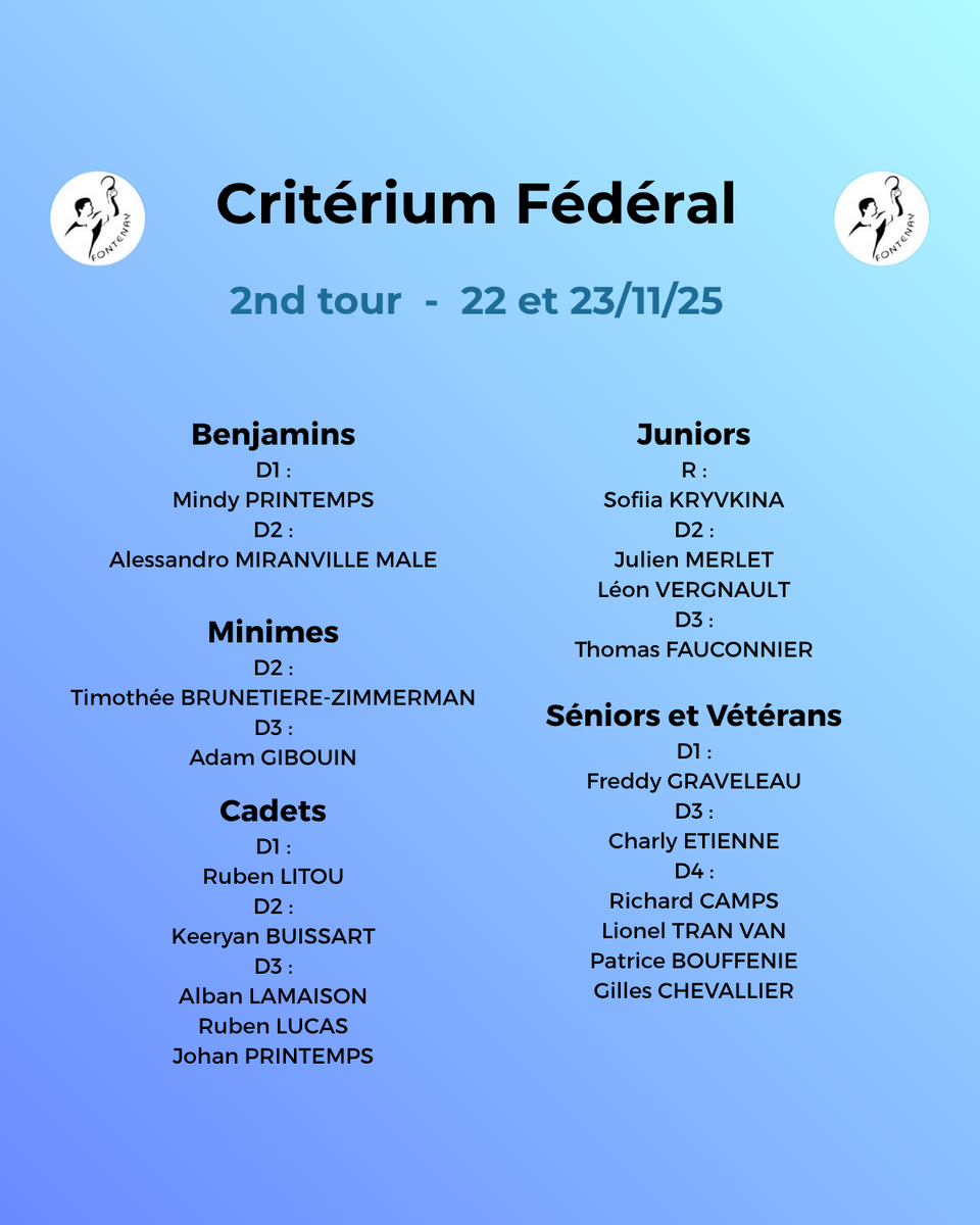 Ce week-end aura lieu le 2nd tour du critérium fédéral. Le club sera représenté dans toutes les catégories jeunes avec 13 joueurs !!! Egalement 6 séniors seront en compétition dimanche matin. Bon match à tous !!! 🏓🏓🏓