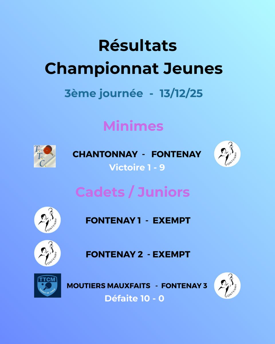 Résultats de la 3ème journée de championnat jeunes : 1 victoire et 1 défaite. BRAVO A TOUS ALLEZ LE TTCF 🏓🏓🏓