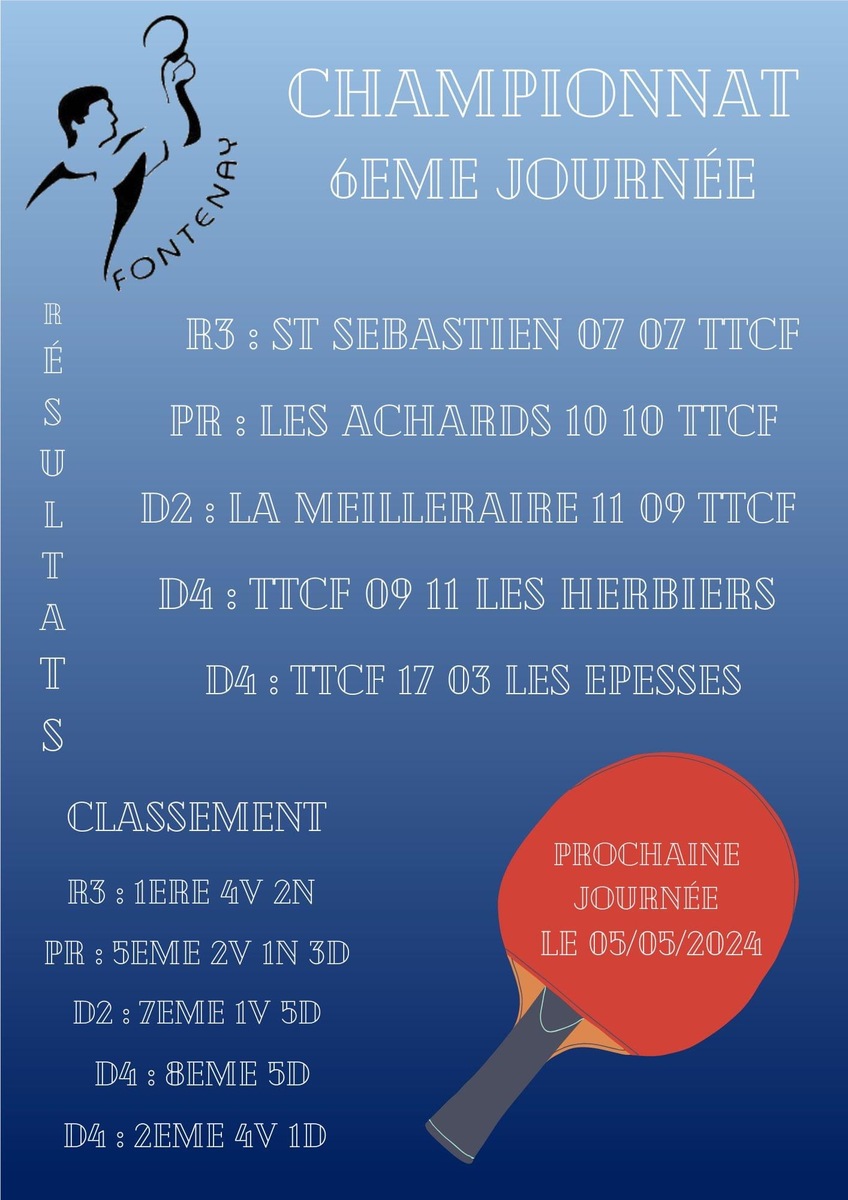 Résultat de la 6eme journée : Les équipes 1 et 2 reviennent avec le match nul. La D2 et une D4 perdent de justesse. L'autre D4 gagne facilement à domicile. Lors de la dernière journée, l'équipe 1 devra faire un bon résultat pour valider la montée en R2. La D2 devra gagner pour éviter la descente. Prochaine et dernière journée le 5 mai. Allez TTCF 🏓🏓🏓
