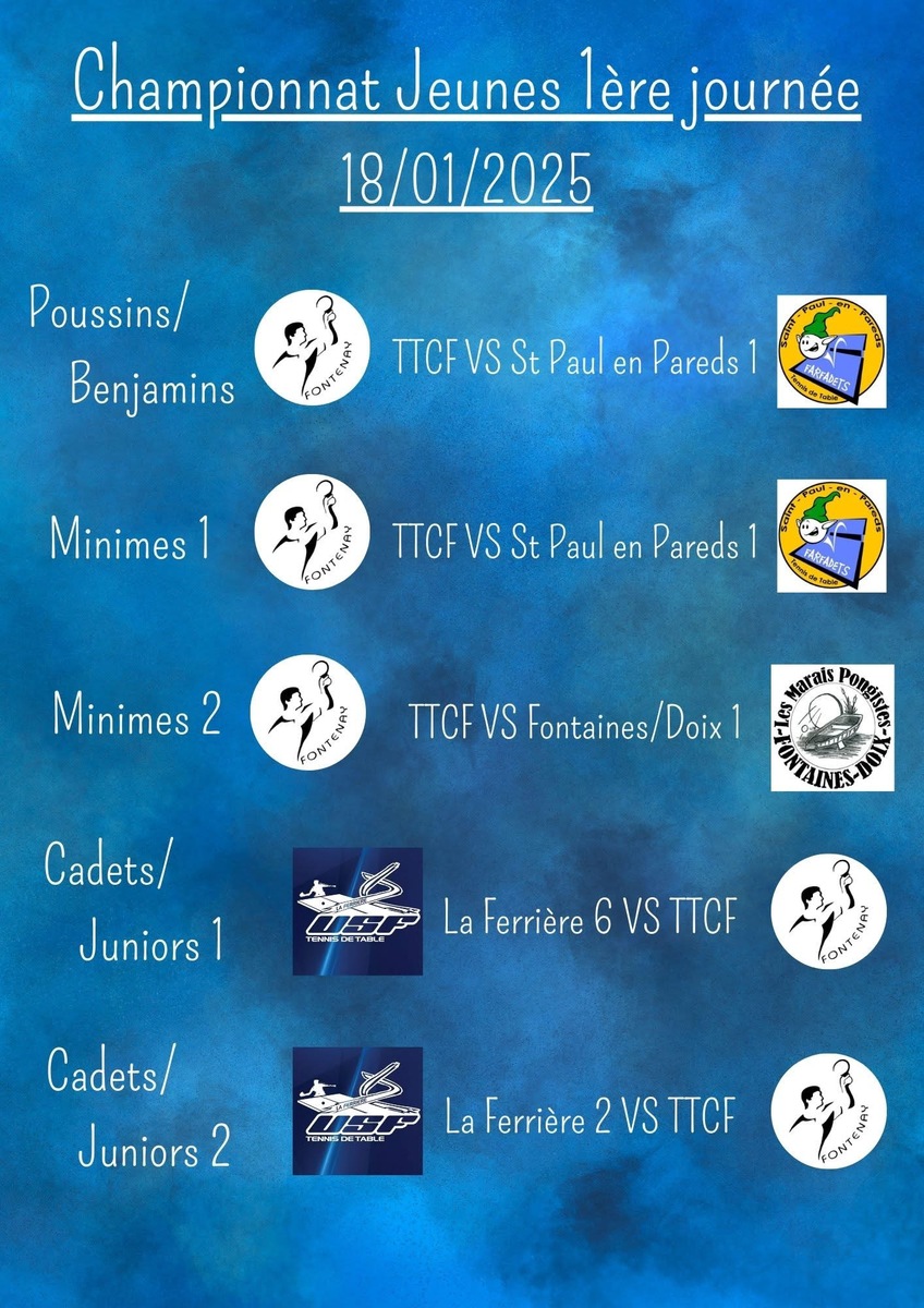 Reprise du championnat jeunes ce week-end. Les poussins Benjamins et les minimes joueront à partir de 15h samedi à domicile. Les cadets Juniors se déplaceront à La Ferrière samedi matin. Allez le TTCF