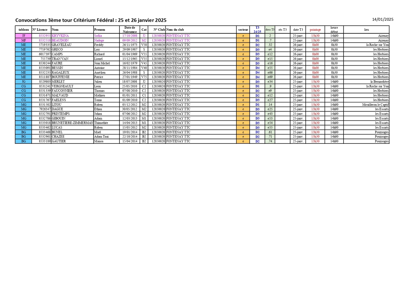 Vous trouverez ci-joint les convocations pour le 3ième tour du Critérium Fédéral.