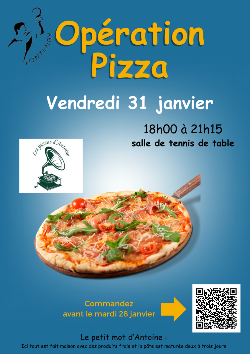 Le TTCF organise une vente de pizzas le vendredi 31 janvier 2025 en partenariat avec Les Pizzas d'Antoine. Vous pouvez commander vos pizzas en scannant le QR code ou en cliquant sur le lien ci-dessous au plus tard le mardi 28 janvier 2025. Les pizzas sont à régler directement par helloasso. Elles seront distribuées à partir de 18h00 et jusqu'à 21h15 le vendredi 31 janvier 2025 à la salle de tennis de table de la Grande Prairie.