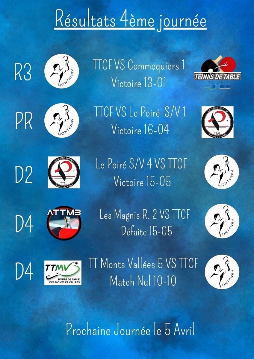 Résultats de la 4eme journée : Bonne journée pour l'ensemble de nos équipes. La R3 a validé son maintien La PR est toujours en tête de sa poule. La D2 a également validé son maintien. La D4 (5) a fait match nul et devra gagner face à Pouzauges début mai pour la montée en D3. La D4 (4) continue son apprentissage. Prochaine journée le 5 Avril