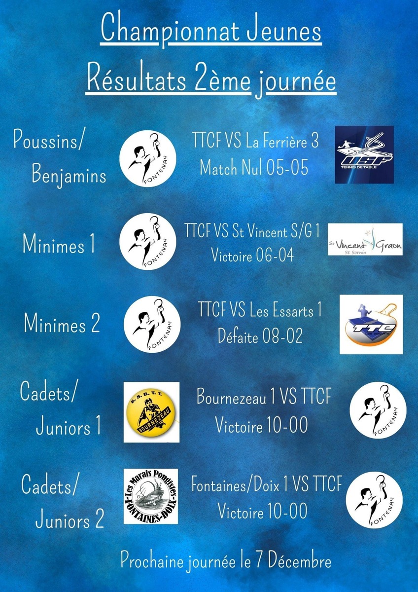 Résultats du Week end : Bilan Positif chez les jeunes avec 3 Victoires 1 Match nul et 1 Défaite. 3 équipes sont assurées de jouer en D1 en 2ème phase !!! BRAVO ET FÉLICITATIONS Prochaine journée le 7 décembre