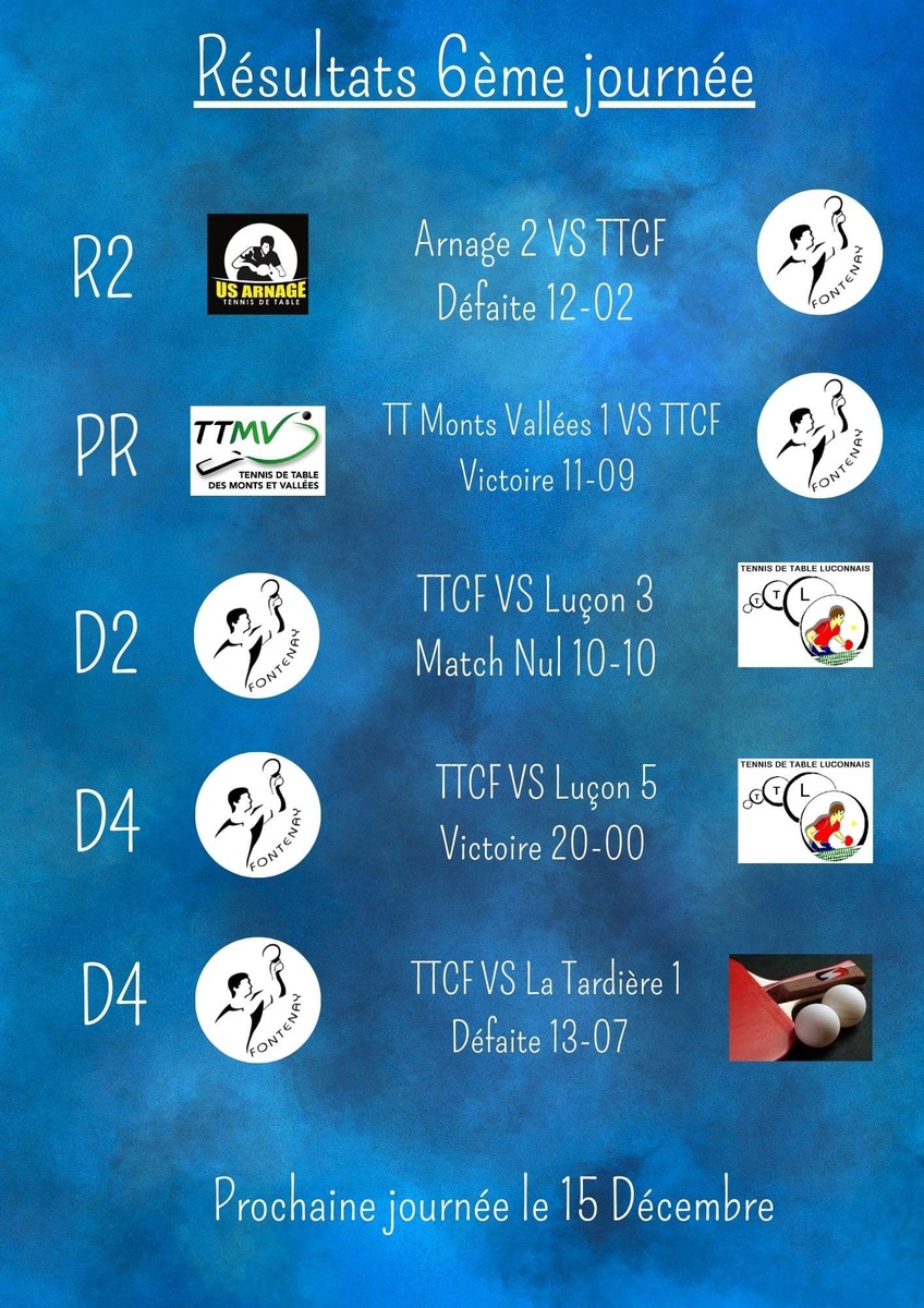 Bilan mitigé chez les séniors avec 2 Victoires 1 Match nul et 2 Défaites. L'équipe 5 a perdu son match pour la montée en D3😢 Prochaine journée le 15 décembre 🏓 Allez TTCF🏓
