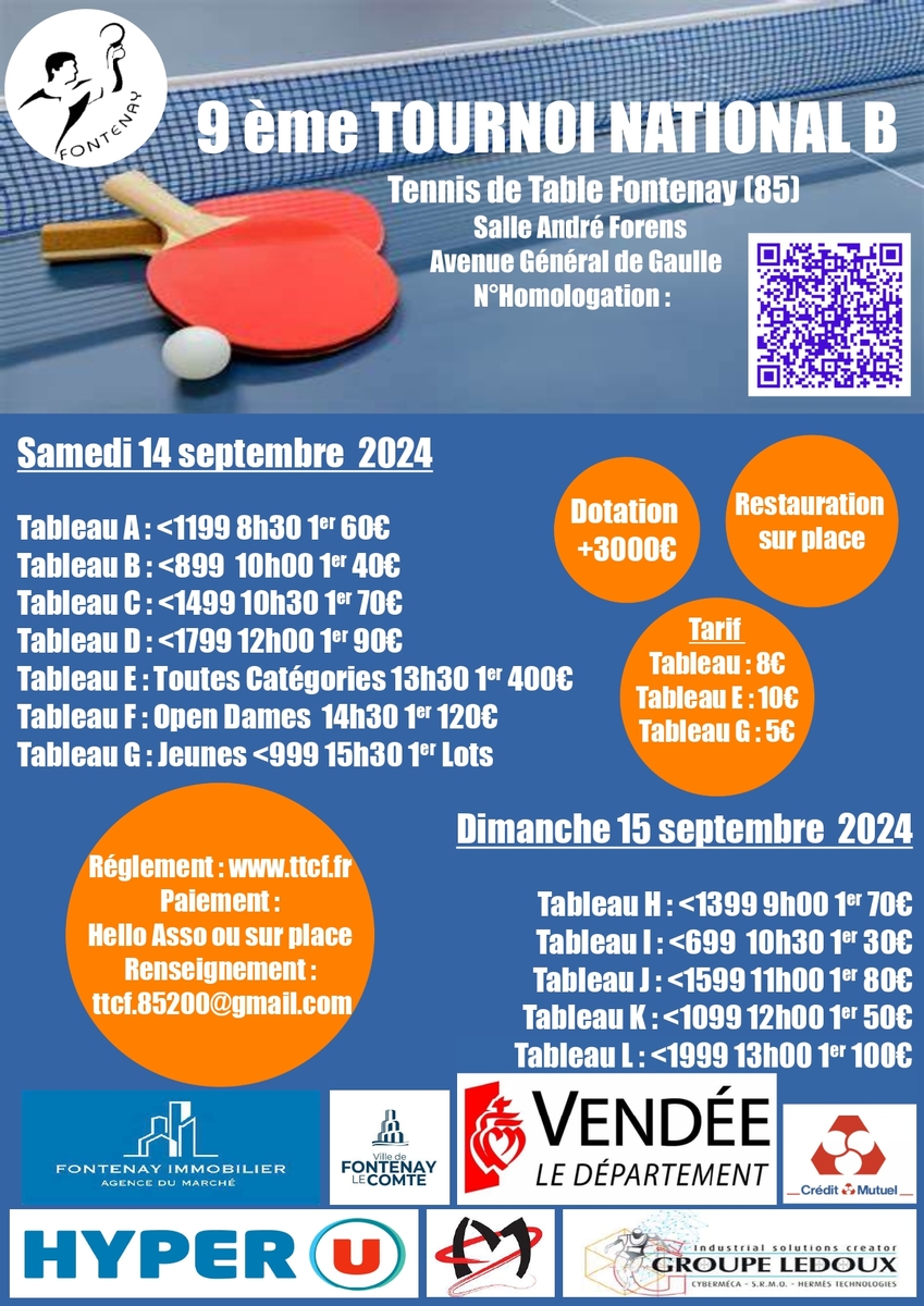 Nous organisons notre 9ème tournoi National B les 14 et 15 septembre 2024 à la salle de la grande prairie à Fontenay-le-Comte, veuillez trouver ci-dessous le lien pour l'inscription :