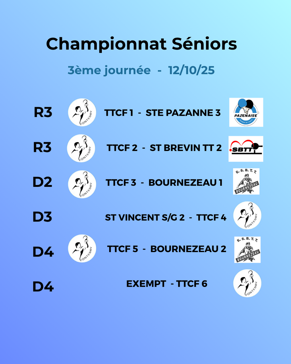 A domicile, nos 2 R3 --> dimanche à 14h30, la D2 et une de nos D4 --> dimanche à 9h.
